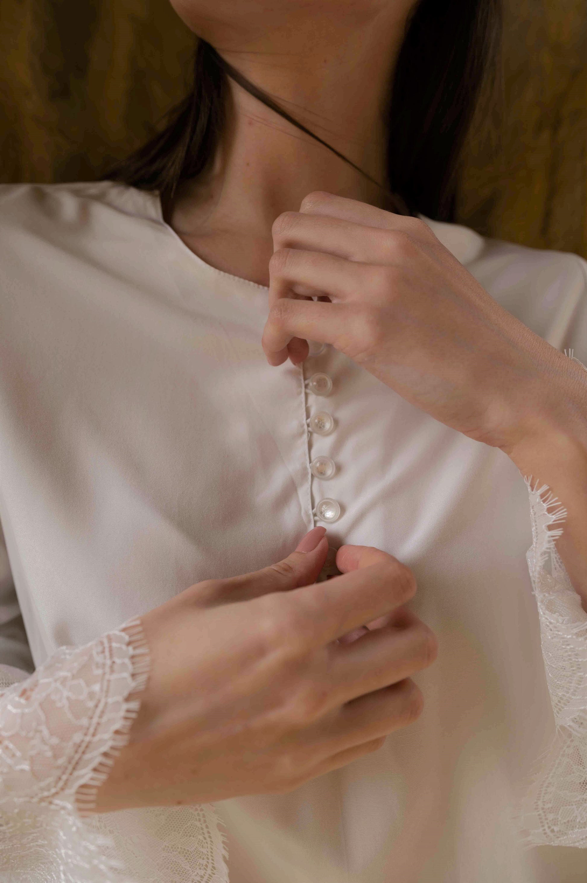 Our bohemian lace blouse is crafted from a gentle, luxurious soft cotton fabric with a flowered buttons on neck opening. featuring with a touch of thick luxurious and textured lace on a wide sleeve and at the end of the blouse giving a romanticising look.