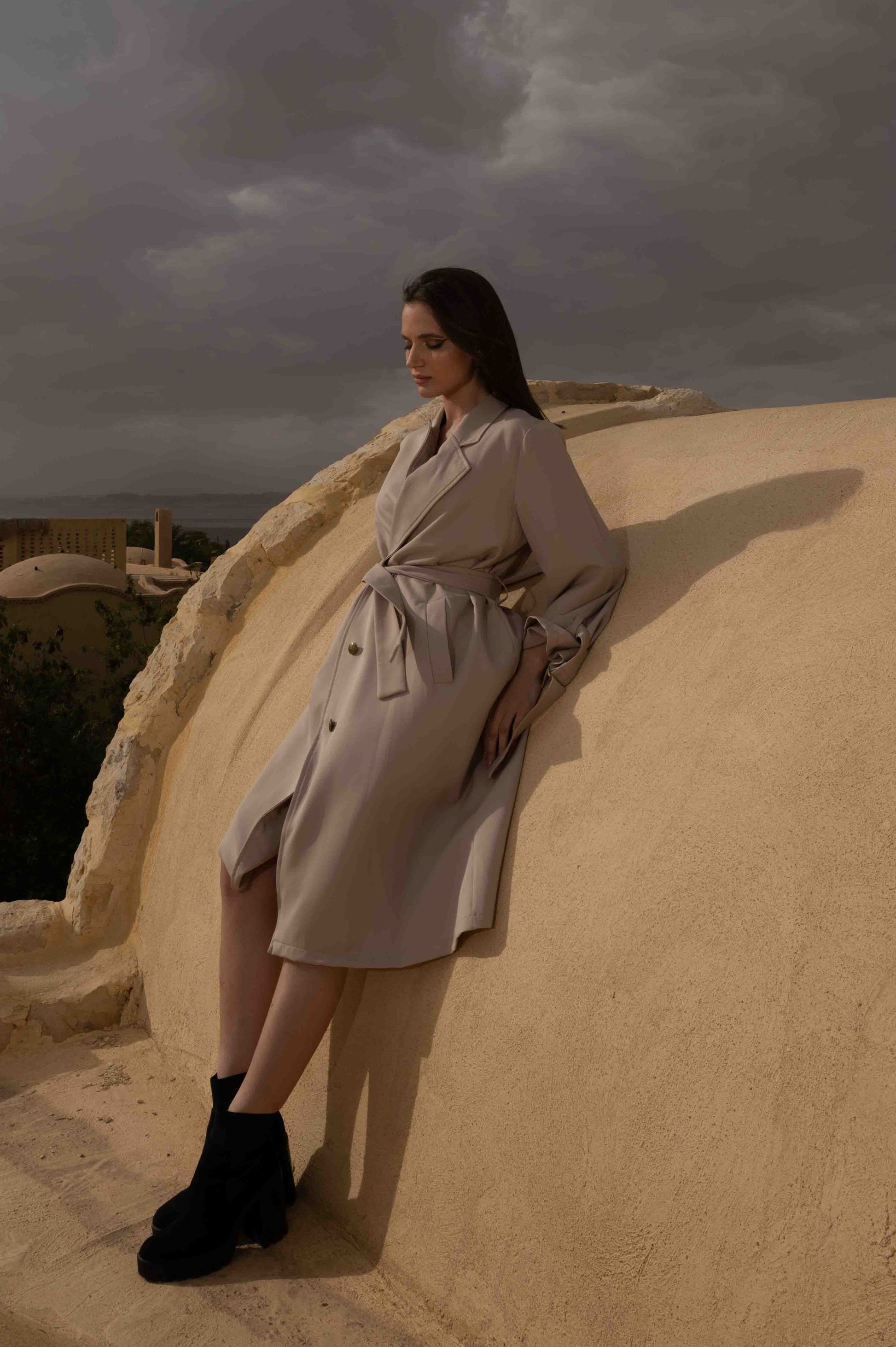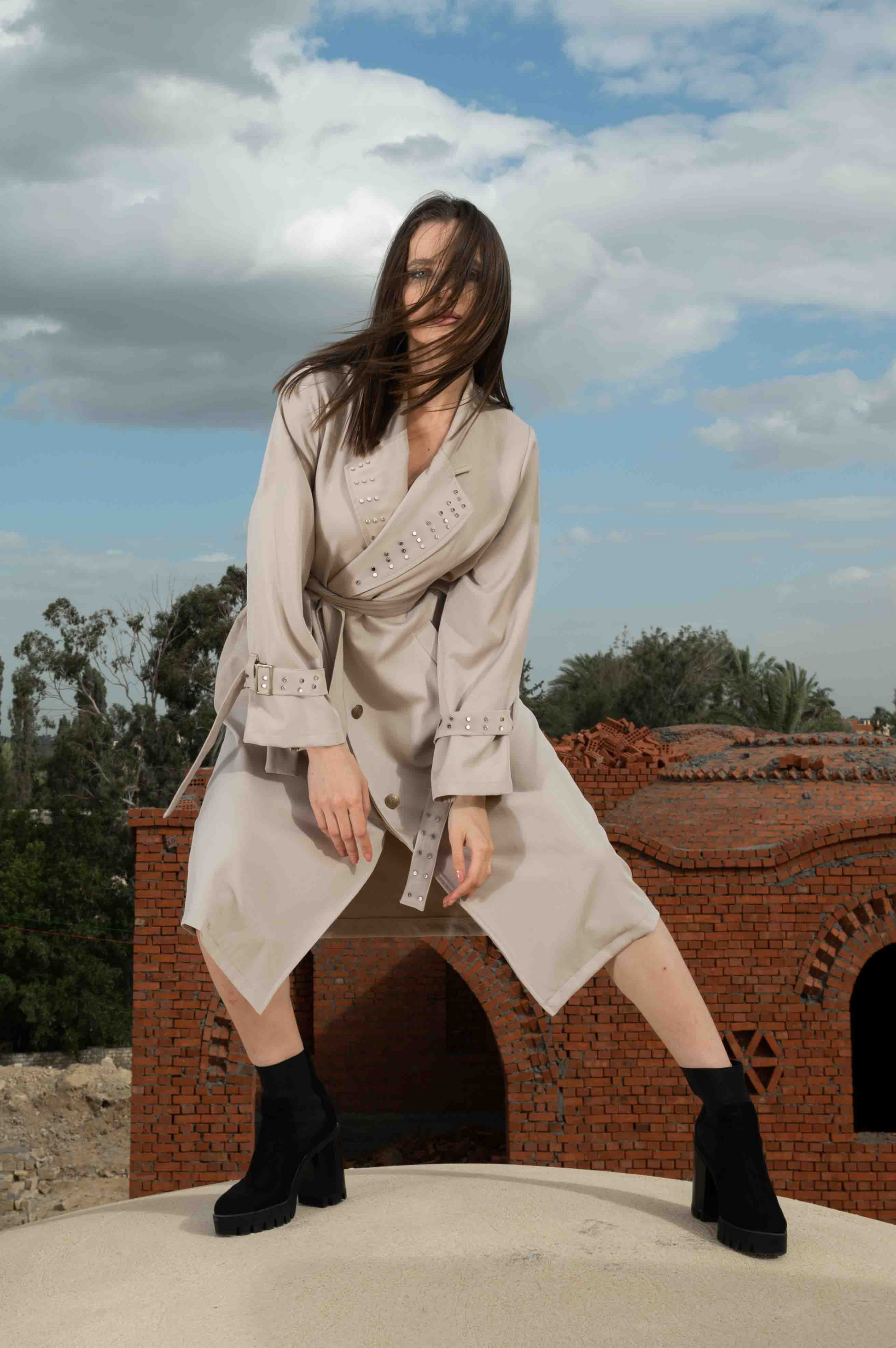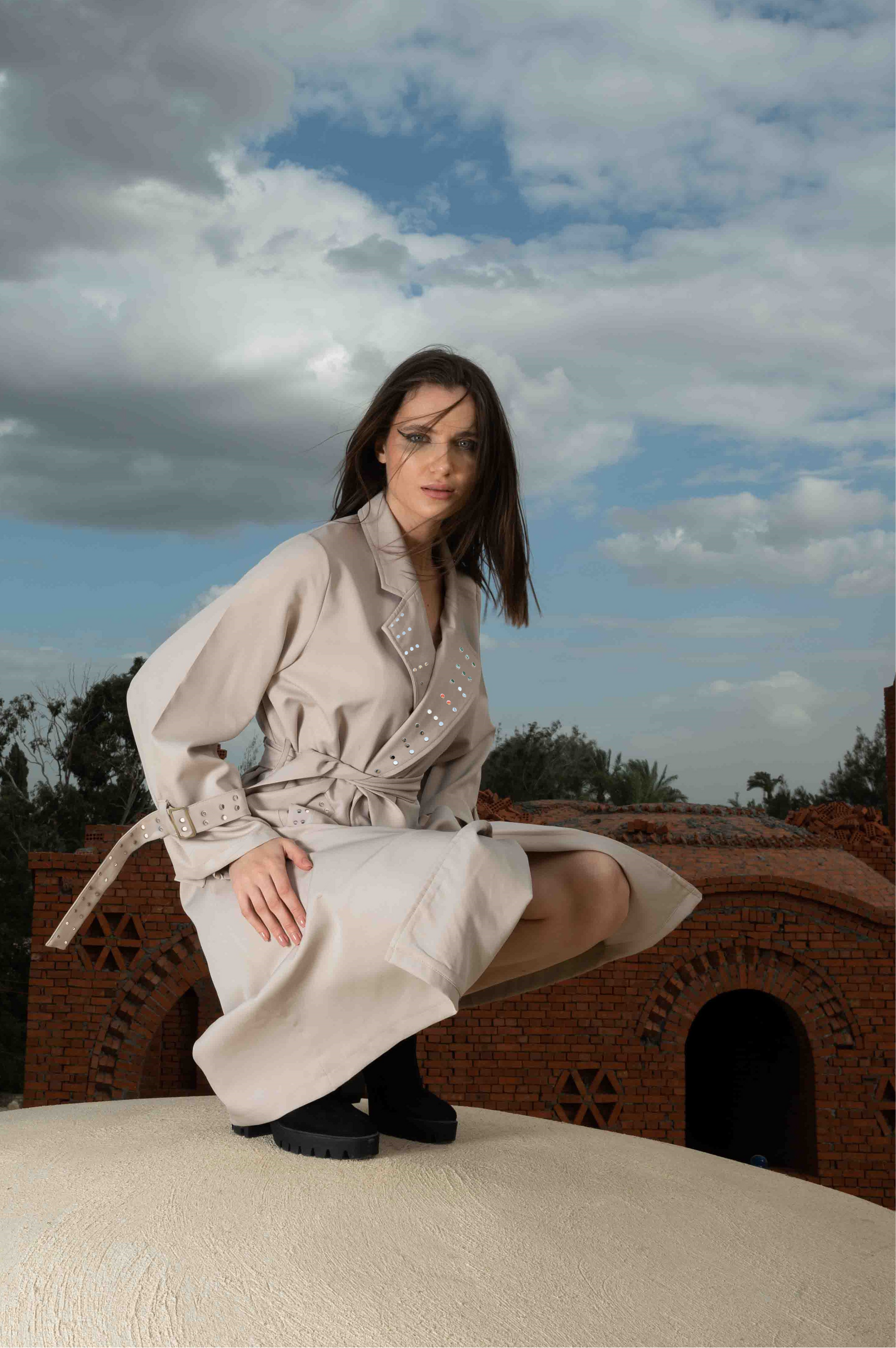 The Miss 'S' Summer Coat is crafted from a delicate, luxurious fabric with pearls on its collars, pockets and the two belts on sleeve.